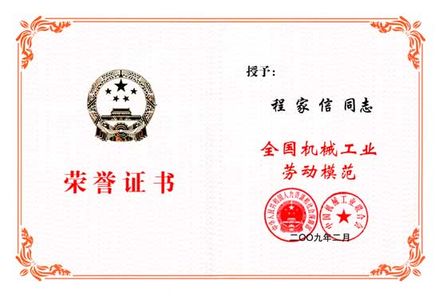 日前,全国机械工业劳动模范名单予以公示,公司装配车间主任程家信由浙江省机械联合会、温州市机械联合会共同推荐,并最终通过全国评选领导小组办公室审核,成为一名光荣的全国机械工业劳动模范。