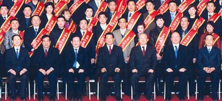 中共中央政治局常委、全国政协主席 贾庆林(下排中)、全国机械工业劳动模范 程家信(上排左二)