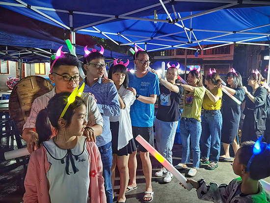 夜幕降临,快乐还在延续,灯影幢幢,灯光晚会上大家载歌载舞,大人们在流光溢彩的掩护下做回了“小孩”,大家的脸庞被快乐悉数照亮。